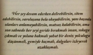 Satır aralarında kullandığı çeşitli yazarlara ait aforizmalarla yazılarına bütünlük sağlamasını çok sevdim. Hüzünlü anlatım tarzında farklı bir tat var ayrıca karamsarlığının farklı bir dokunuşu var, hayat verişi var kelimelere…