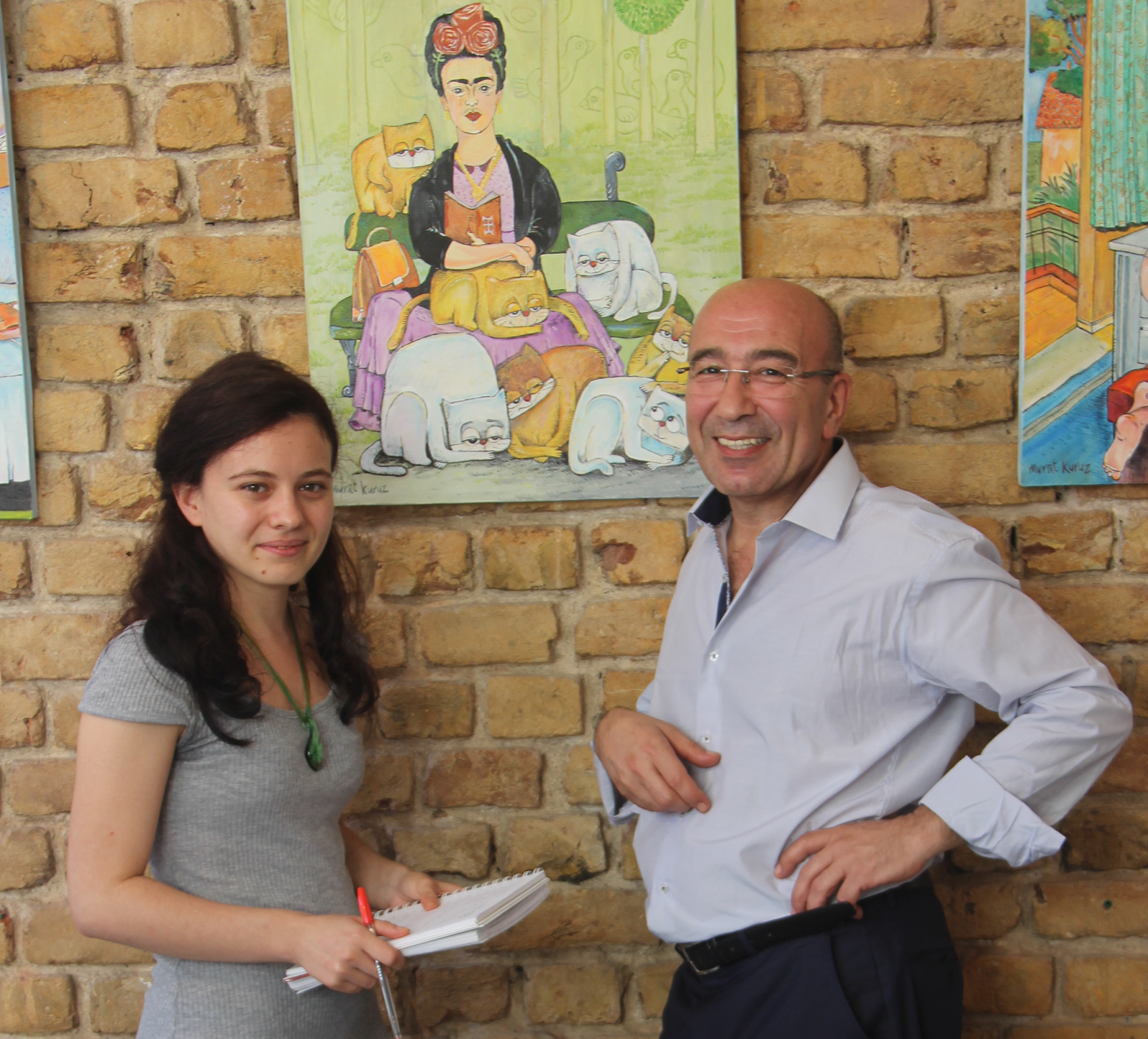 2 Eylül’de Gama Sanat Galeri’sinde Murat Kürüz’ün ‘Kedi Kadınların Hikayesi’ isimli altıncı sergisi açıldı. Sergi öncesinde Murat bey ile keyifli bir söyleşi gerçekleştirdik. Kafaları kedi vücutları insan bu eserlerde kullanılan renkler ve oluşturulan kompozisyonlar bakanın yüzünde gülümseme sağlıyor. Canlı renkler ve baktığınızda kendi içlerinde minik hikayecikleri görüyorsunuz. Eserlerin yaratıcısı Murat Kürüz’ün neşeli hep gülümseyen yüzü gibi aydınlıklar.